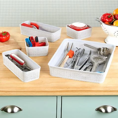 Clean up your drawers and give everything its place with this 5-Pc. Drawer Organizer Set. It includes 3 sizes of organizers to hold a variety of items. The set nests for compact storage when not in use. Made from: PolypropyleneSet includes:- Large, 11″W x 14″D x 2-1/2″H- 2 Medium, 4″W x 10″D x 2-1/2″H, each- 2 Small, 4″W x 4″D x 2-1/2″H, each
