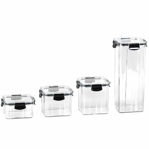 Bring order to your pantry or cabinet with this 8-Pc. Locking Lid Airtight Canisters. Use them to hold flour, sugar, pasta, rice or other pantry staples. The airtight lids will keep the contents fresh, while the clear sides enable you to see what’s inside. Made from: PlasticSet includes:1 Small, 4″W x 4-1/2″D x 2-5/8″H2 Medium, 4″W x 4-1/2″D x 3-3/4″H, each1 Large, 4″W x 4-1/2″D x 9-1/2″H4 Lock lidsNotes:Freezer safe