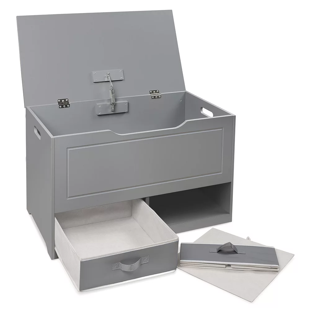 Badger Basket’s multi-talented Up and Down Toy Box handles large toys in the top bin and small items in the two removable and reversible baskets below. Safety built-in for peace of mind. Kids can help themselves to favorite items and clean up before bed.