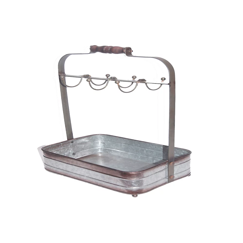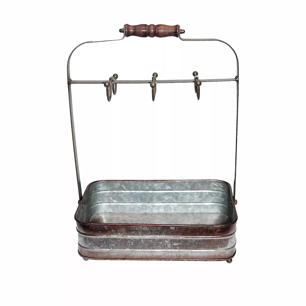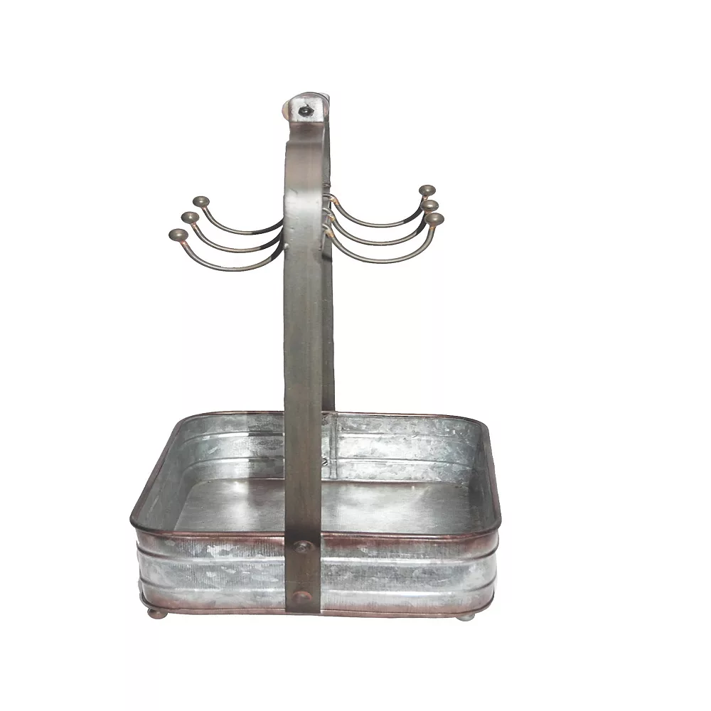 Bring this crockery holder home and add a rustic charm to your settings. Made from galvanized metal sheet; this crockery holder features six symmetrical cup hooks along with a rectangular basket. With a weight capacity of 4.5 pounds; it makes a great tea time accessory that provides you enough space for holding tea pots; milk; sugar and cups. The handle at the top is made from wood that provides a great accessibility while moving it from one place to another.