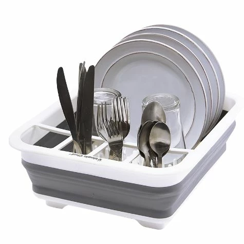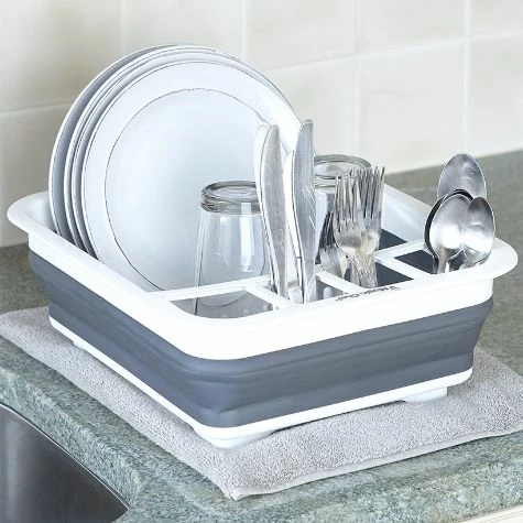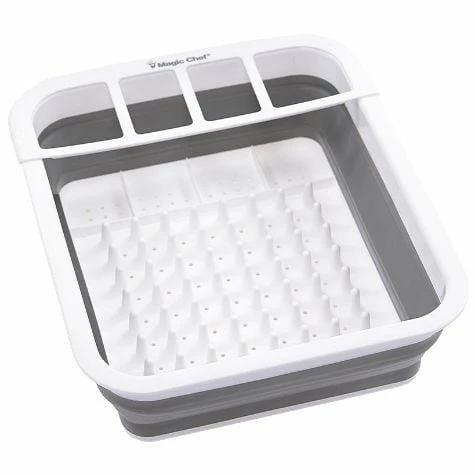 Solve your storage problem with this Collapsible Dish Rack. Compact and portable, it folds flat in a second for convenient storage in a cabinet to keep your countertop uncluttered. Use it to dry dinnerware, glassware, utensils, gadgets and kitchen tools. Has a removable utensil compartment. Made from: Polypropylene and rubberized plasticMeasurements: 12-1/4″W x 14-1/2″D x 5″H and collapses to 2-1/2″HNotes: Dishwasher safe