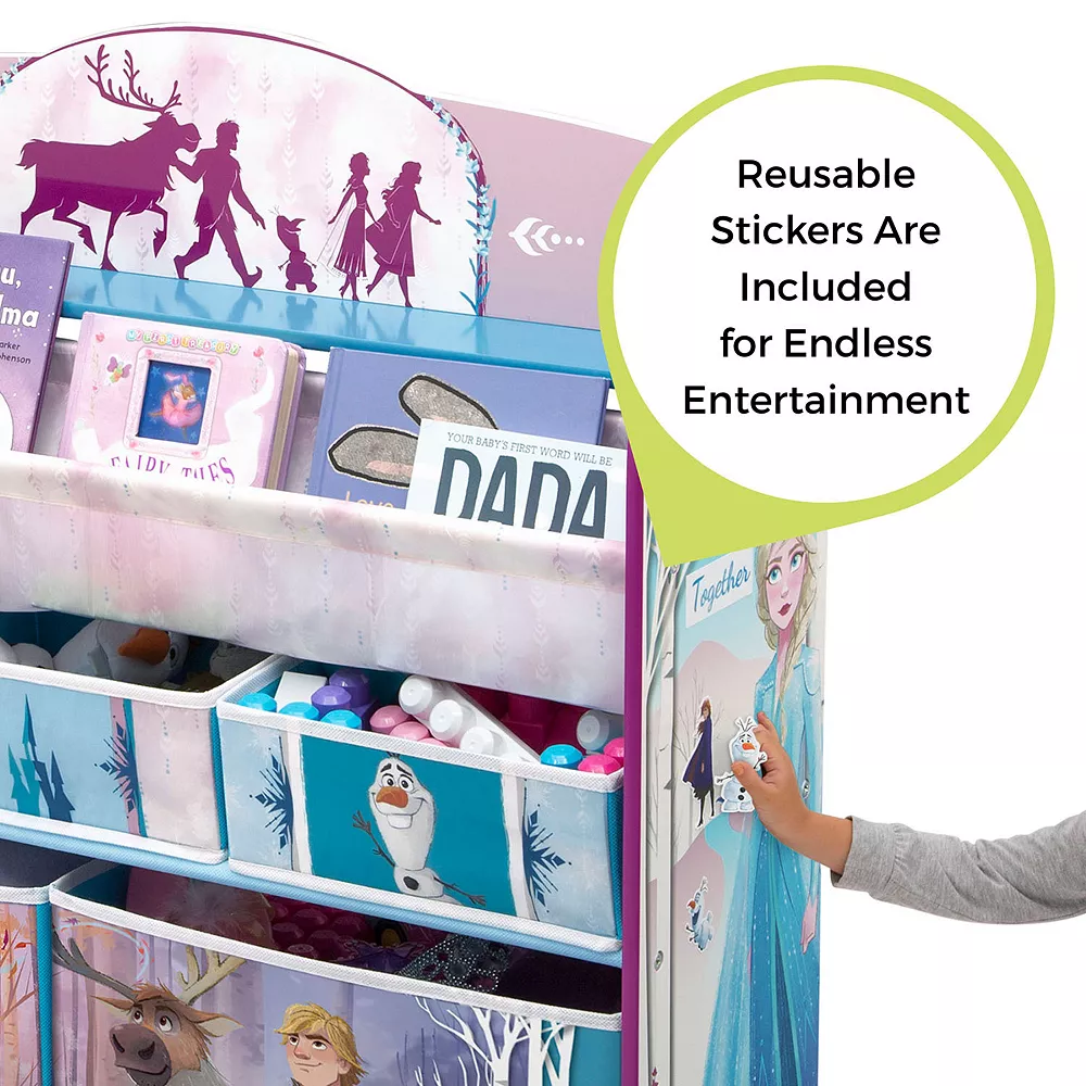 - Designed for little kids with big imaginations, this cool toy and book organizer features colorful graphics of Anna, Elsa, Kristoff and Sven, plus comes with reusable vinyl cling stickers that allow your child to decorate the sides themselves
