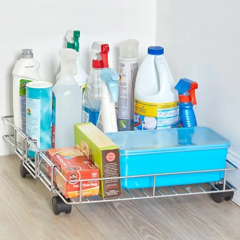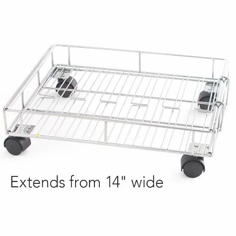 Maximize storage with this Expandable Rolling Metal Basket. It is short enough for tight spaces and can be enlarged by extending the sides. The 4 wheels make it easy to roll around. Use the basket to hold pantry items such as potatoes, baking supplies, paper goods and more. Made from:MetalMeasurements:14″W x 17″D x 5″HExtended, 25″WNotes:Assembly required; assembly hardware included