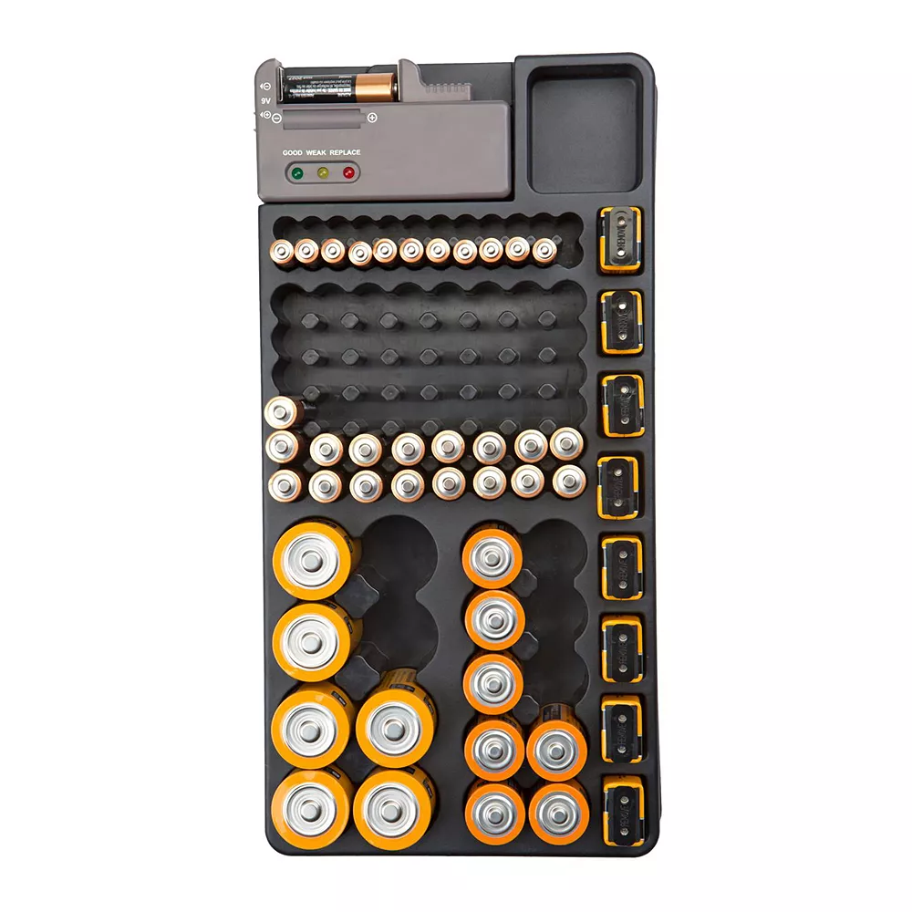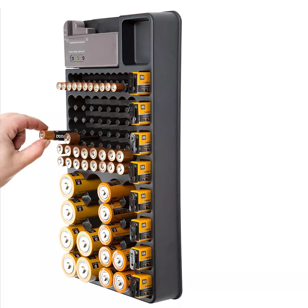 - Stores up to 98 batteries in various sizes