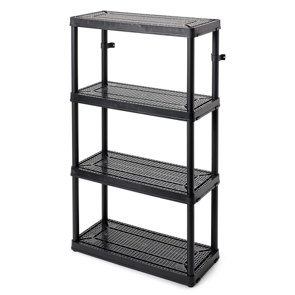 This 4-tier storage shelf features durable resin material that will never rust, dent, or peel, making it durable enough for both indoor and garage use. With its simple, no-tool setup, lightweight body, and black coloring you can easily make this storage unit work in any room of the house.