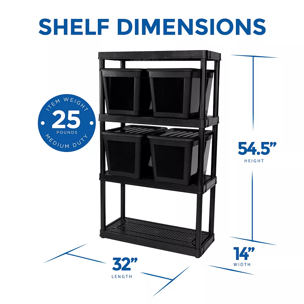 This 4-shelf medium duty rack includes 4 large size bins with lids. Each bin has a 10-gallon capacity. The shelf is made from durable resin material that will not rust, dent, or peel, making it perfect for both indoor or garage use. Each shelf has a ventilated floor and can support up to 100 pounds.
