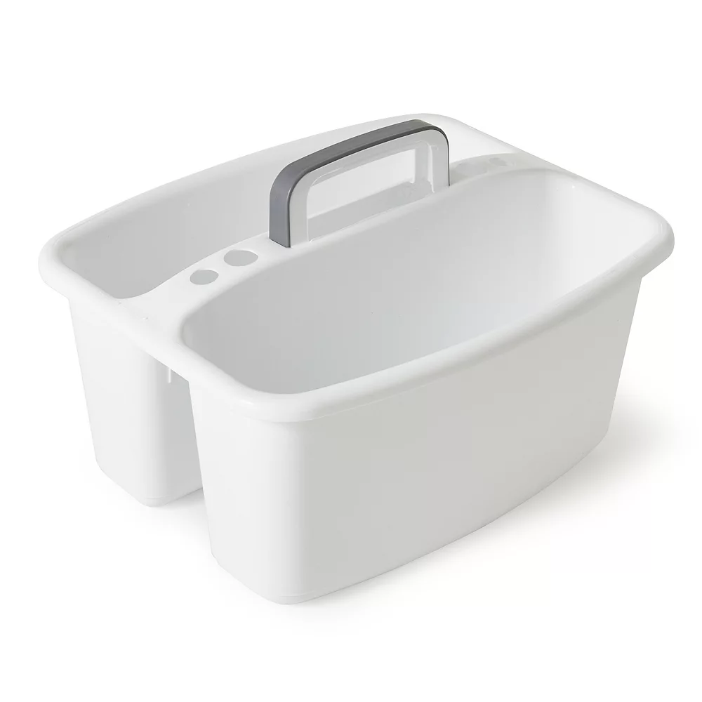 Keep all of your personal supplies neat and tidy in one convenient storage tote. Separate your cleaning supplies between the two sections for enhanced organization. The gray carry handle makes it easy to take this divided storage caddy on-the-go.