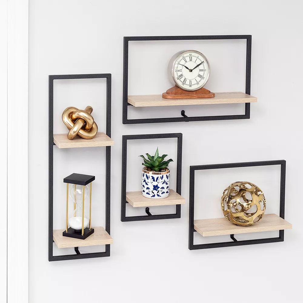 - Floating horizontal shelf with hidden bracket displays streamlined decor