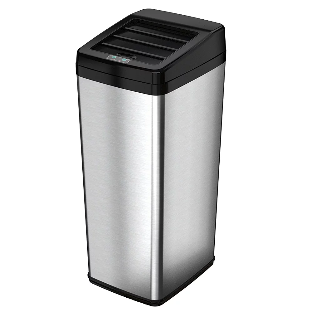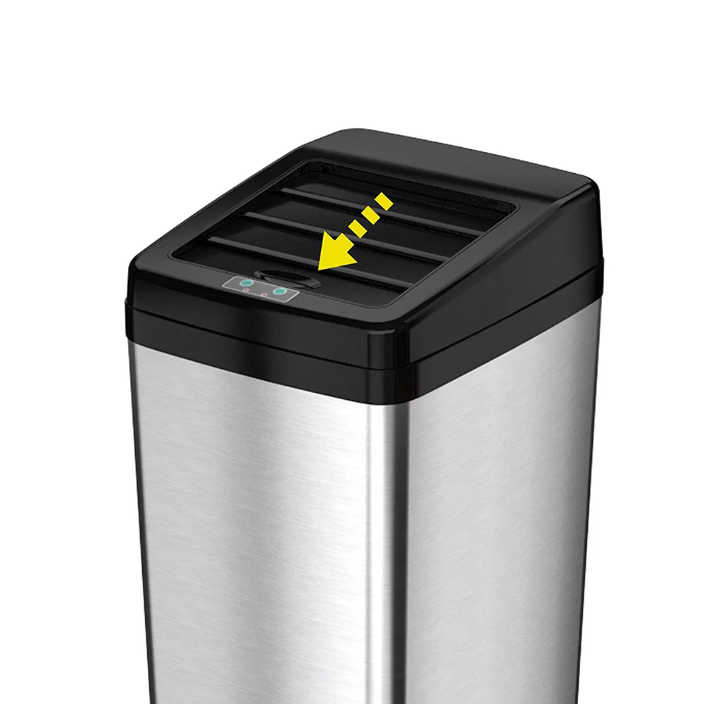 - Sensor-operated lid automatically slides open when your hand or debris comes within six inches of the infrared sensor.