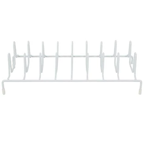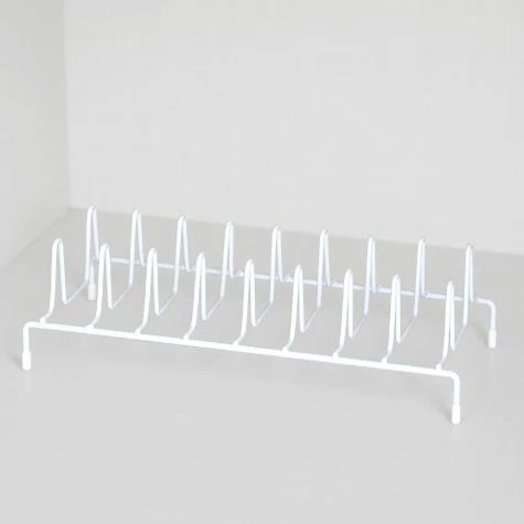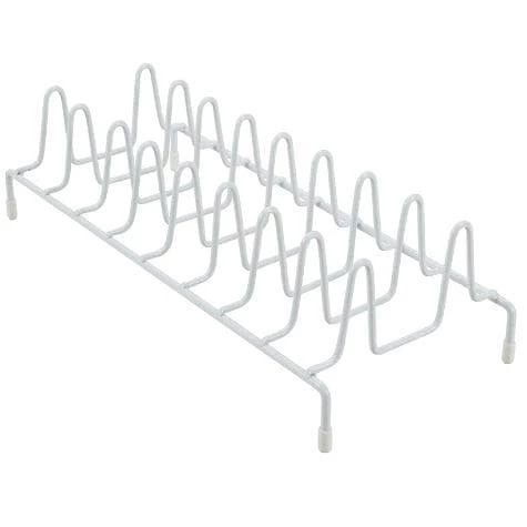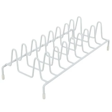 Bring order to a kitchen cabinet and make it easier to find what you need with this Lid and Pan Organizer. It has 8 slots to hold pots, pans and lids, as well as baking sheets, pizza pans, cutting boards and more. Has rubber feet to protect surfaces. Made from: MetalMeasurements: 5-3/4″W x 13-1/2″D x 4″H