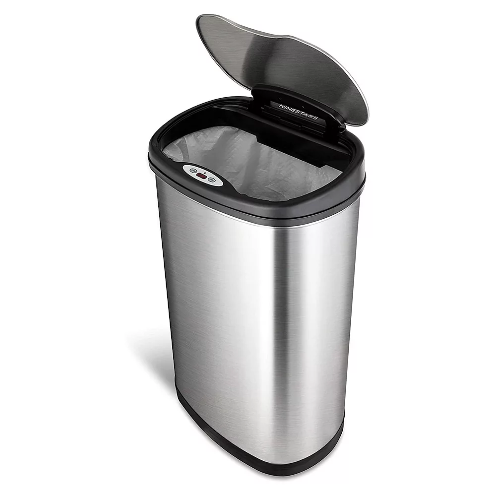 This stainless steel trash can features a motion sensor lid that uses infrared technology to automatically open when motion is detected within 10 inches or at a 130-degree angle from the sensor. The lid will then stay open while it senses debris in range, and softly closes 3 seconds after you move away. Additionally, manual mode keeps the trash can lid open longer, giving you more time to clean up larger messes with ease. An included ring liner holds your trash bag in the bin to keep the bag from falling down as you throw away trash. The sleek, stainless steel design doesn’t show fingerprints and has a non-skid base to keep your kitchen, bathroom, or office looking its best. Overall, this garbage can measures 16.54 inches long, 11.54 inches wide, 26.5 inches tall, and requires 3 C-sized batteries for operation.
