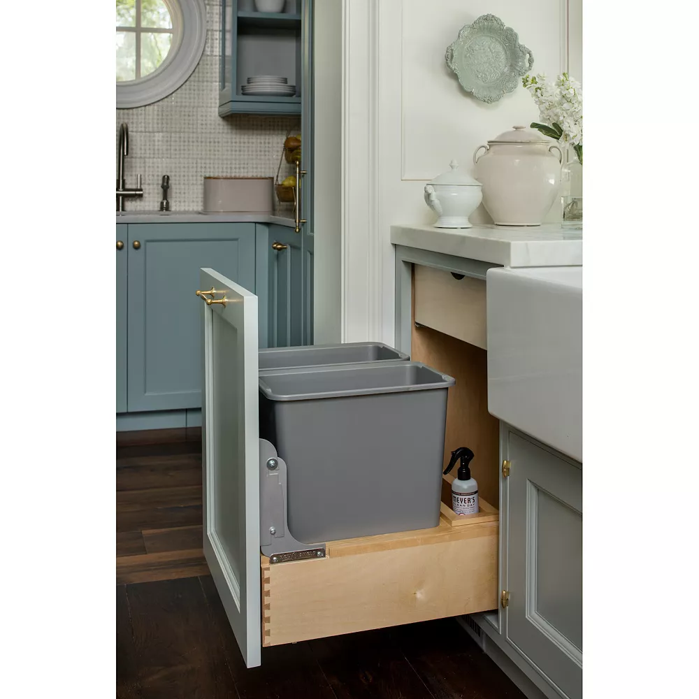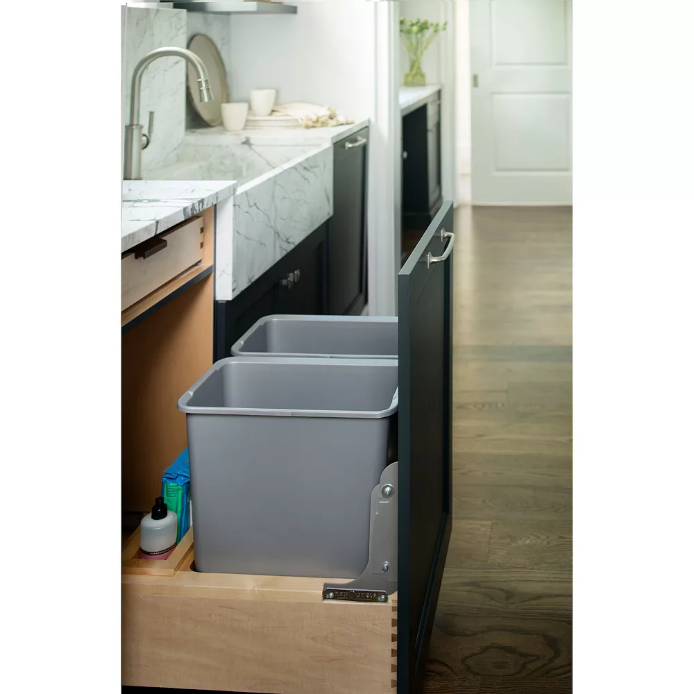 - Keep your kitchen clean by hiding your garbage can inside your cabinetry with the Rev-A-Shelf Double 30-Quart Mounted Pullout Waste Container