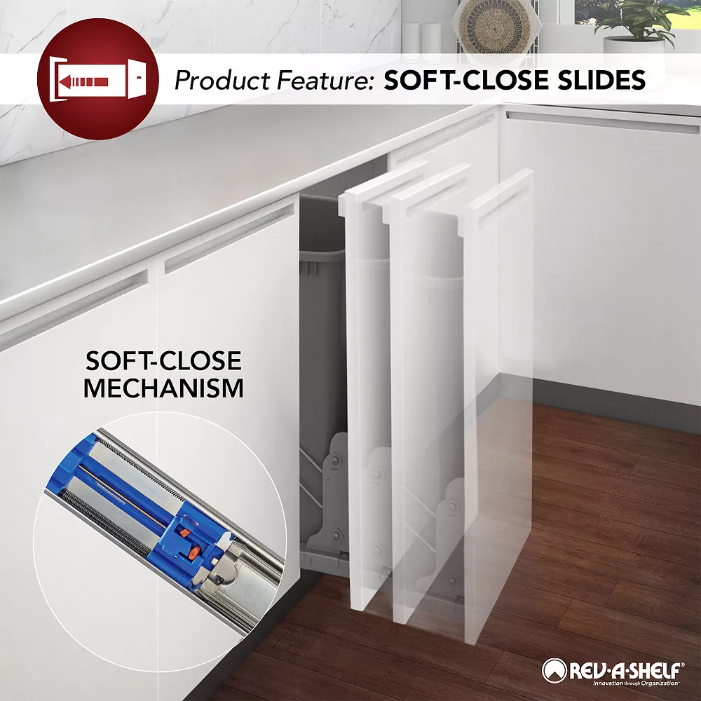 Enjoy the convenience of simply pulling out your waste bin to dispose of anything in your kitchen, without having to worry about it being exposed in your kitchen. This is an easy-to-install design for a no-fuss set-up designed for a cabinet opening of exactly 18 inches. These waste containers are designed for absolute sturdiness with front and rear mounting, pre-installed door mount brackets, and full-extension 150 lb. rated soft-close ball-bearing slides for total stability. Featuring Soft-Close to keep cabinets safe when sliding the top mount.