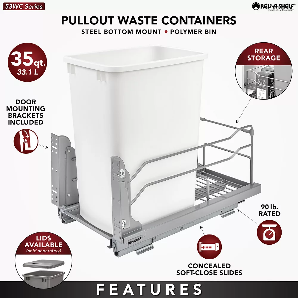 - Includes (1) 35-quart waste container, (1) metal frame, (1) pair of slides, mounting hardware, and door mount brackets