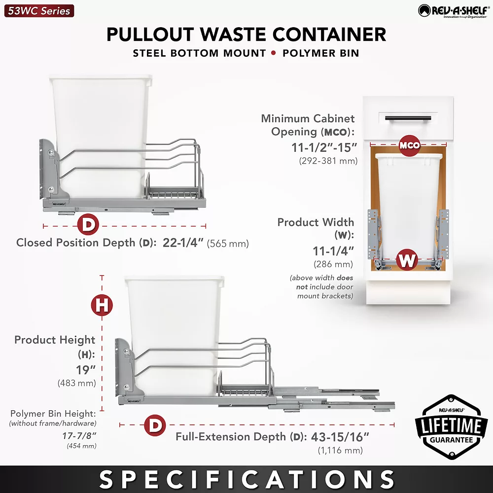 Easy to install, this pullout waste container kit is designed for 15, 18, and 21-inch base cabinets. A single 35-quart container is included with the mounting hardware. Enjoy a clear space in your kitchen without the eyesore of your trash can thanks to this Rev-A-Shelf Single 35-Quart Pull Out Waste Container.