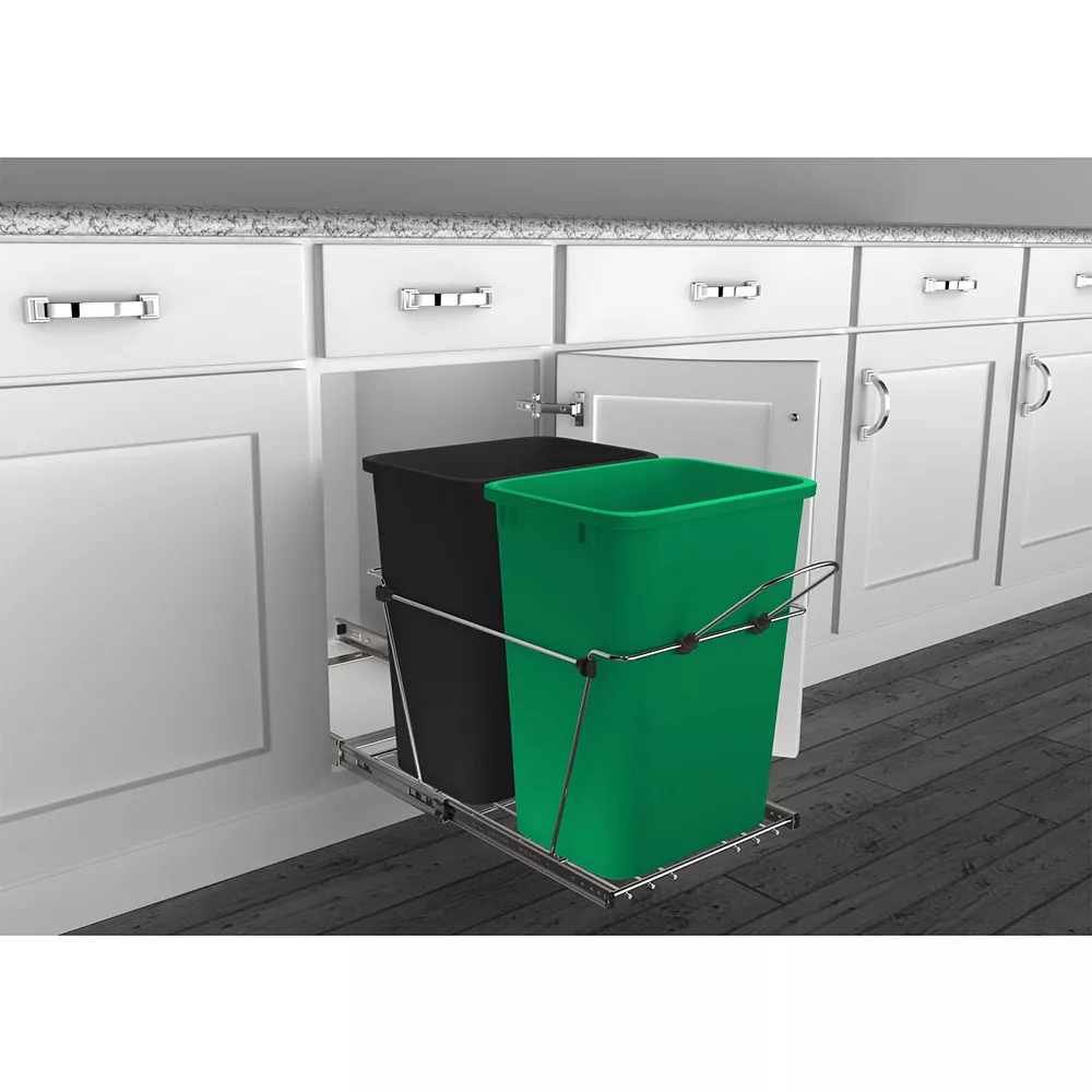 - Keep your kitchen waste container hidden but easily accessible with this double 27-quart pull-out system