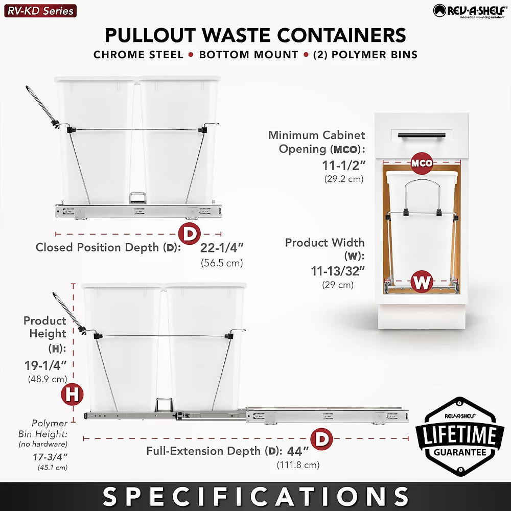 Double-check your cabinet’s opening (inside dimensions) to allow the best fit. Measure side to side (width), front to back (depth), and top to bottom (height). Double-check to make sure your product is within measurements and don’t forget to take into account any obstructions (plumbing, hinges, etc.). Keep your kitchen looking neat and clean while conserving space with the Rev-A-Shelf Double 27-Quart Pull-Out Waste Containers.