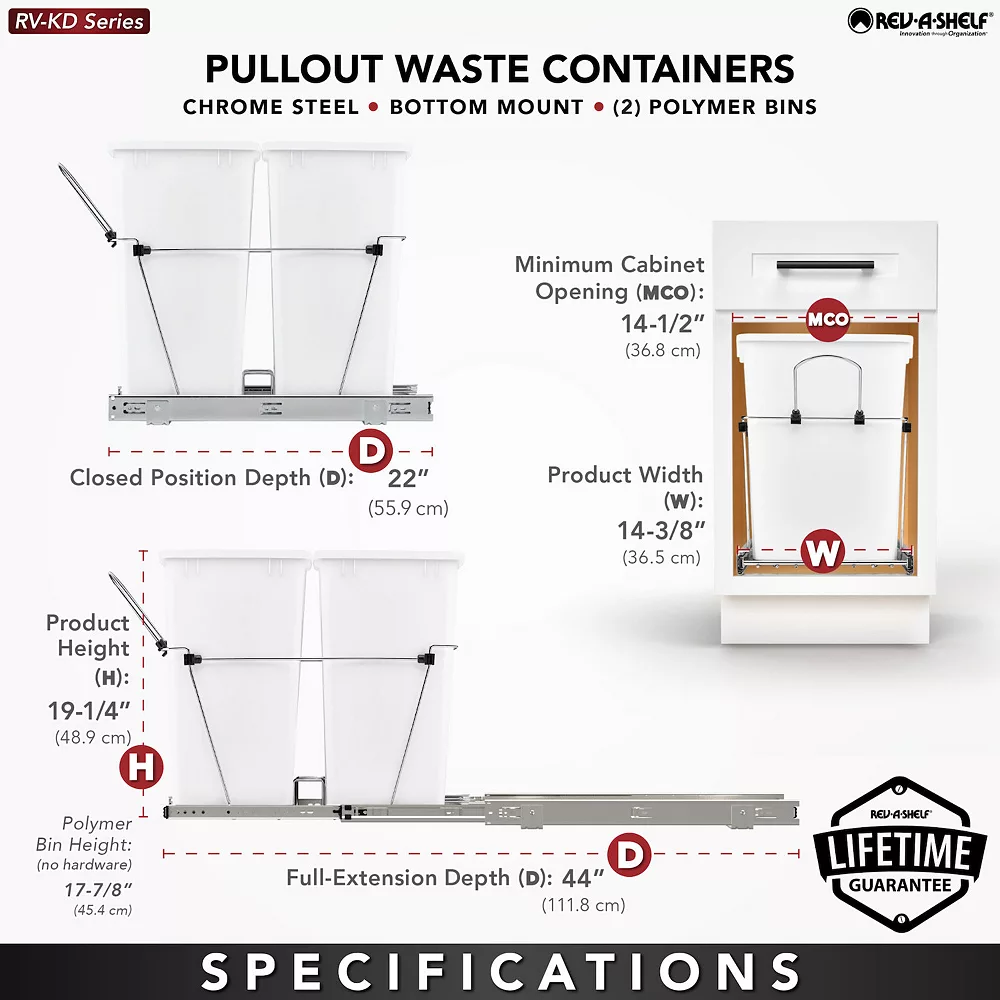Take care of all your kitchen waste with the Rev-A-Shelf RV-18KD-2218C-S Double Waste Containers. Rev-A-Shelf knows waste containers better than anyone else, and their RV series is the right choice for anyone wanting to replace a standing waste container.