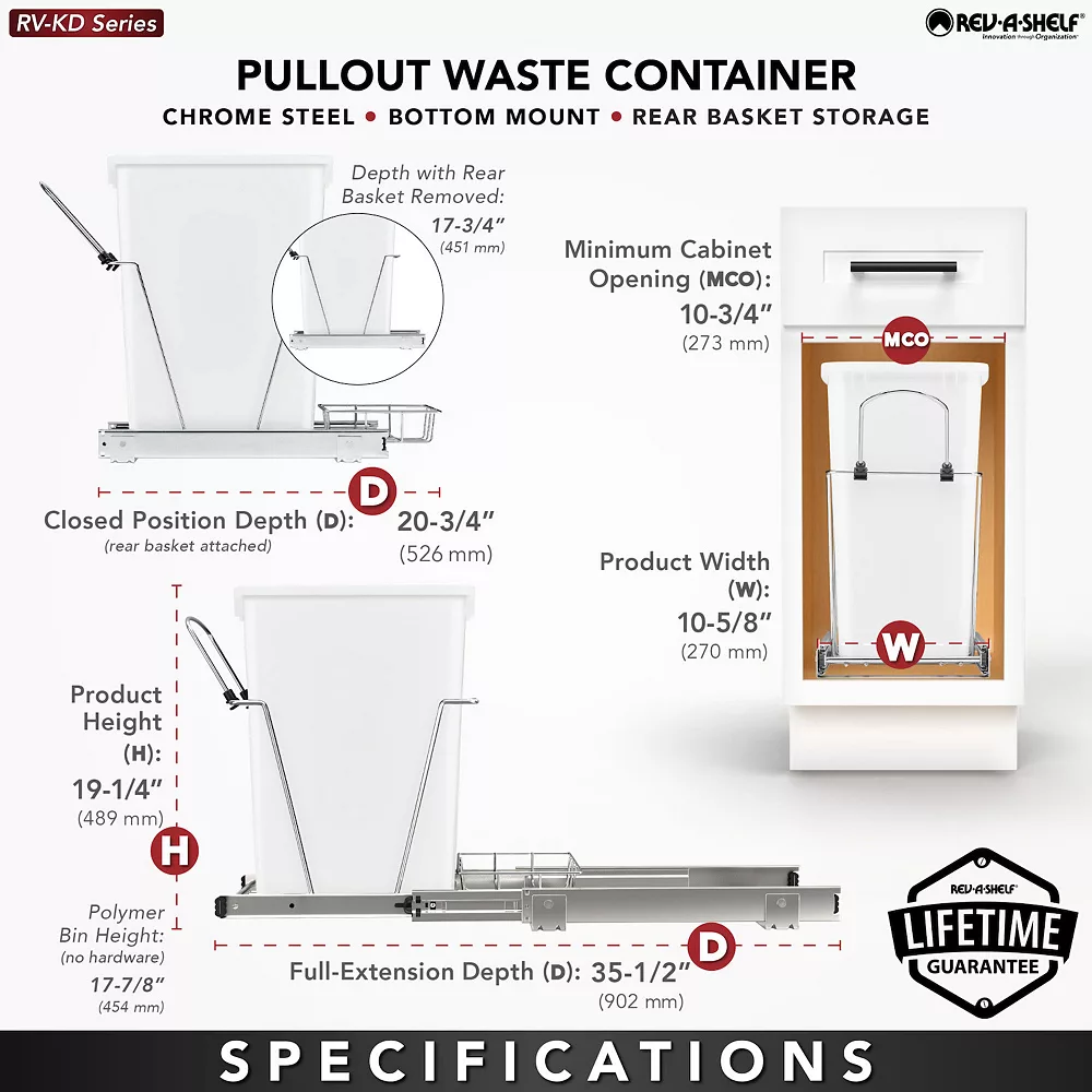 Double-check your cabinet’s opening (inside dimensions) to allow the best fit. Measure side to side (width), front to back (depth or length), and top to bottom (height). Double-check to make sure your product is within measurements and don’t forget to take into account any obstructions (plumbing, hinges, etc.). Keep your kitchen looking neat and clean while conserving space with the Rev-A-Shelf 35-Quart Pull-Out Waste Container.