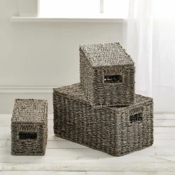 MDesign Woven Seagrass Home Storage Basket With Lid, Set Of 3