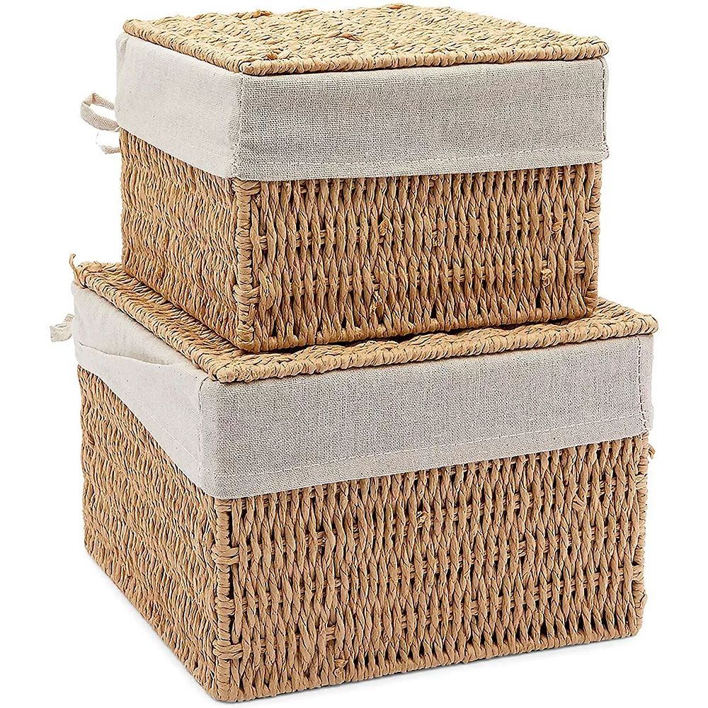 This set of 2 woven storage baskets comes with lids and removable liners to provide versatile storage for a range of items including towels, clothing, beauty products, spices, and general household items. Place inside the bathroom, laundry room, kitchen, living room, and bedroom for decorative and convenient storage. The baskets also make great Christmas, birthday, and housewarming gifts for family and friends. Each basket has enough space to hold your items and is sure to match any rustic, modern, or boho home decorations.